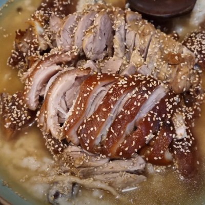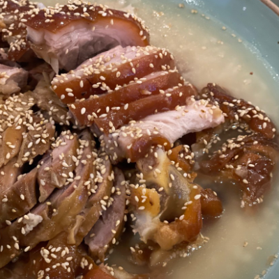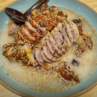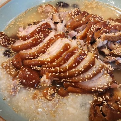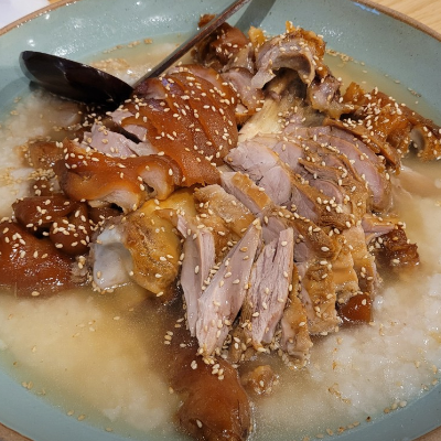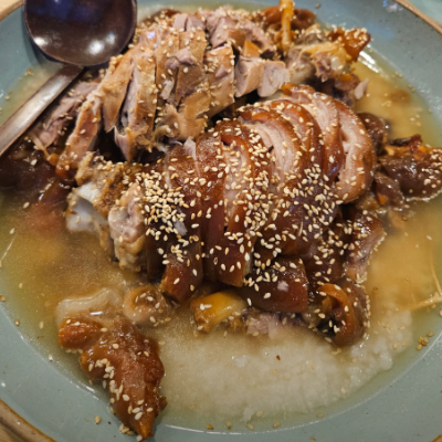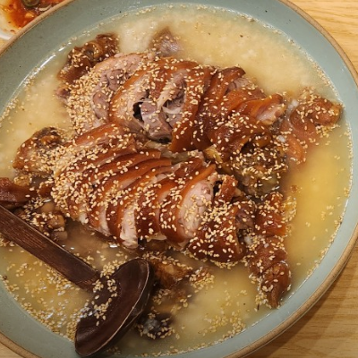 살코기는 부드럽고 겉은 쫀득쫀득한 족발을 먹고 나면 아래에 걸쭉한 죽이 나와 하나의 완성된 요리를 보여주었어요.