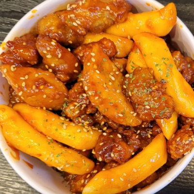 누룽지가루로 튀겨서그런지 밀가루로 튀긴 닭강정보다 속이 편안해요. 떡토핑은 꼭 추가해서 먹어요.
