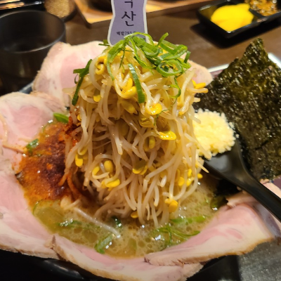 눈꽃교자는 아랫면은 바삭한데다 윗면은 부드러운 두가지맛이 나는 만두였는데 모악산 라멘은 콩나물이 듬뿍 들어가 있어요.