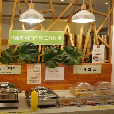 이곳은 셀프바로 부족한 반찬을 더 먹을 수도 있고, 식전 메뉴 보리빵, 떡볶이, 샐러드 등을 무제한으로 먹을 수 있어요.