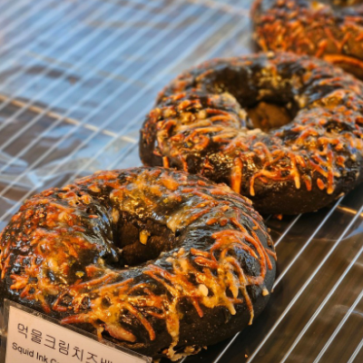 빵만 포장해가다 오늘은 빵이, 커피 해서 카페에서 먹었어요. 먹물베이글 먹었는데 겉바속촉 크림치즈들어 아이스아메리카노랑 찰떡이였어요.