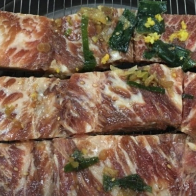 양념갈비 양념간도 짜지않고 부드럽고 맛있어요. 생갈비에 도라지무침 올려서 먹으면 맛있어요.