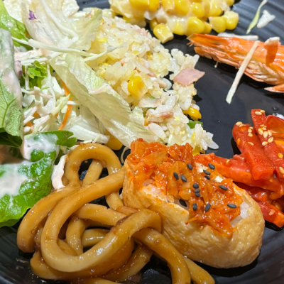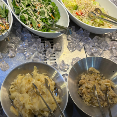 초밥 말고도 타코야끼 탕수육 닭강정 등등 다양한 샐러드바 음식이 준비되어 있어서 질리지 않고 맛있게 많이 먹을 수 있는 것 같아요.